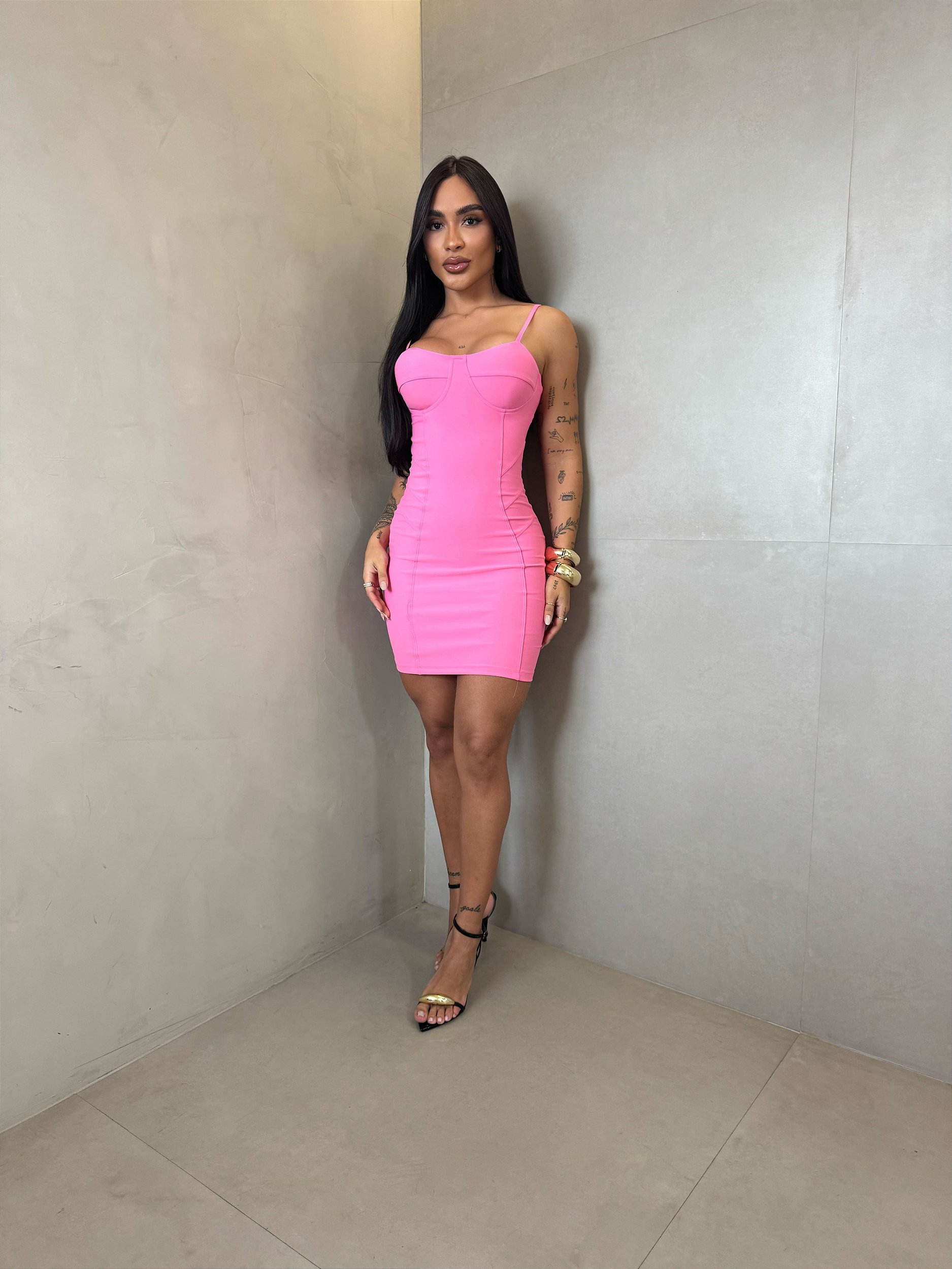 Vestido na Montaria de poliamida, tecido encorpado de alta qualidade, possui bojo que não amassa e não marca, zíper atrás, uma modelagem incrível com recortes que valorizam a silhueta, possui decote nas cortas com botão dourado que não oxida, e regulador nas alças.